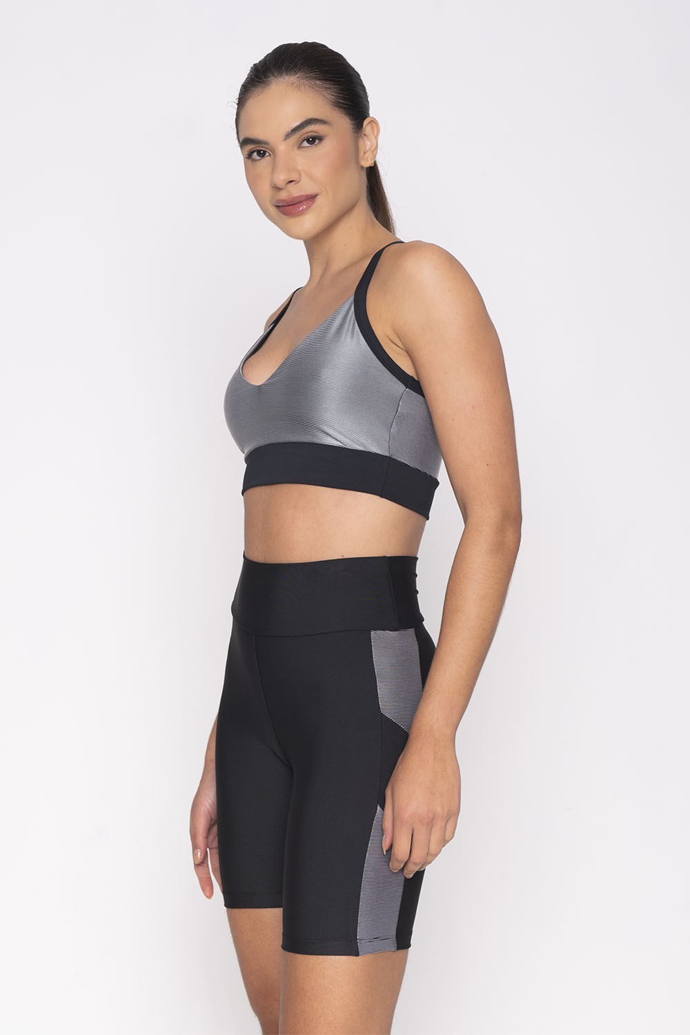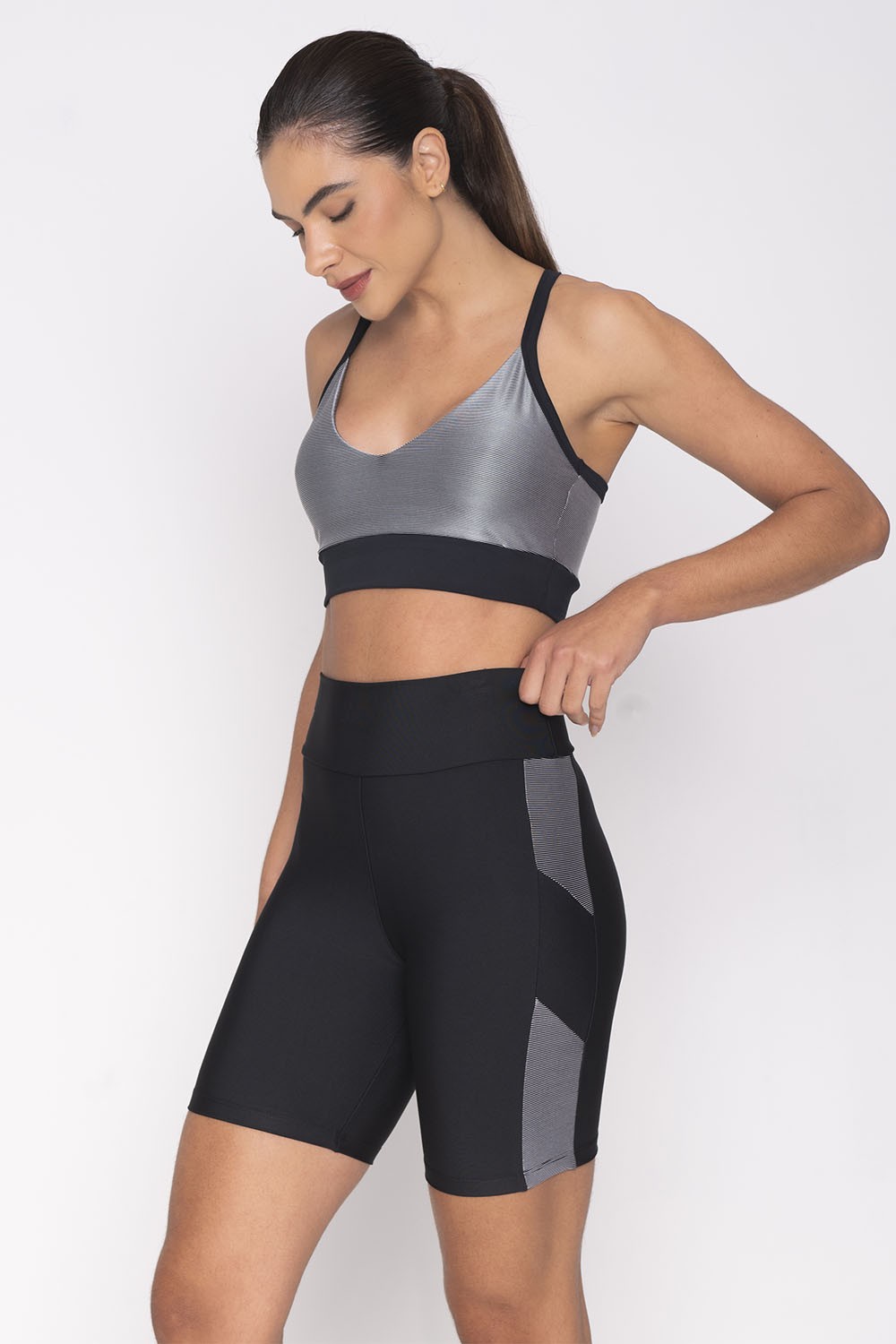 Bermuda fitness preta com detalhes em listras prata nas laterais. O comprimento é acima do joelho, dando mais segurança e tranquilidade, além de o tecido ser ajustado ao corpo e deixar um lindo caimento.