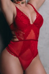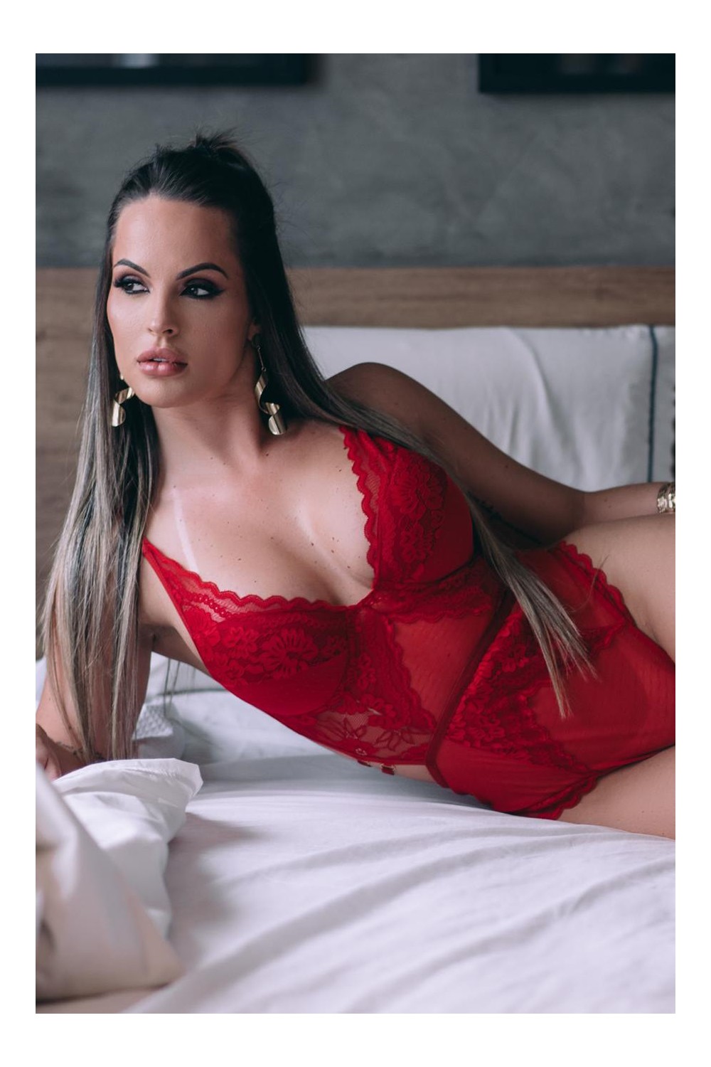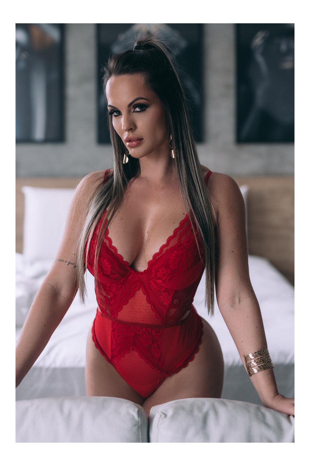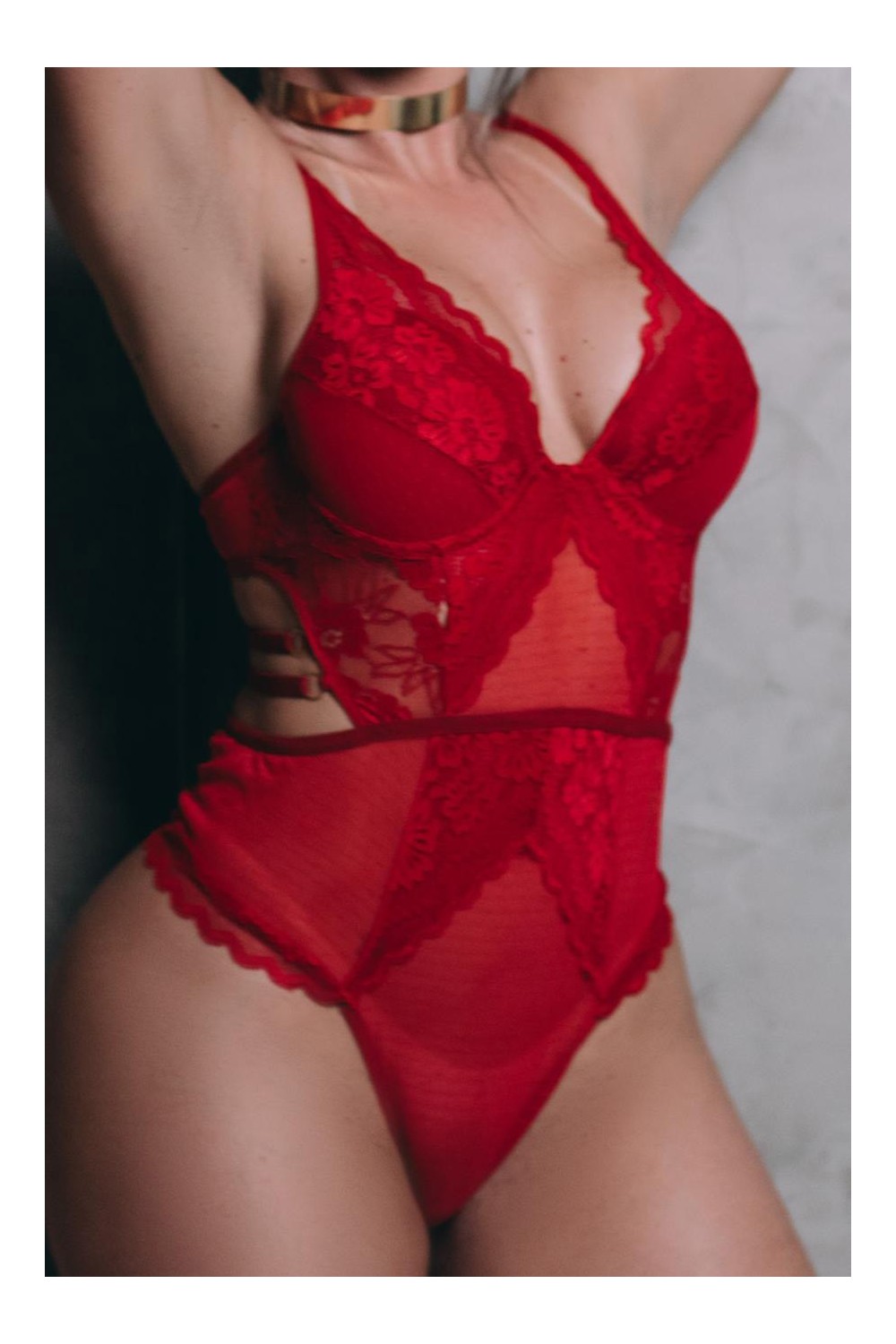 Body de lingerie vermelho feito de renda e tecido transparente. A peça possui recortes sensuais nas laterais e detalhes em renda floral na parte do busto e abdômen. As alças são finas e há detalhes de tiras nas laterais que acentuam a cintura. O tecido transparente nas áreas centrais dá um toque ousado, enquanto a renda adiciona elegância e delicadeza ao design. A gola metálica ao redor do pescoço complementa o visual, trazendo um contraste moderno e sofisticado.