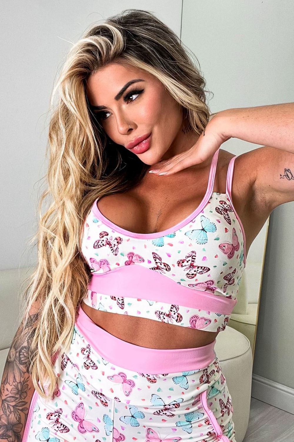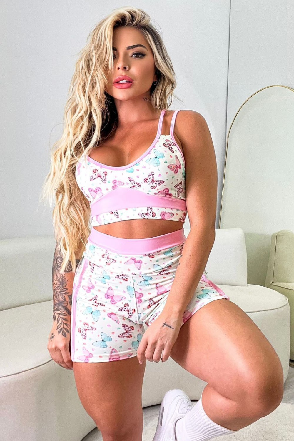 Conjunto fitness composto por top com alças finas cruzadas nas costas e recorte abaixo do busto, e short cintura alta com cós largo modelador. A estampa delicada de borboletas em tons de rosa, azul e detalhes vermelhos sobre fundo branco transmite leveza e feminilidade. O tecido é ajustado ao corpo, oferecendo conforto e sustentação ideal para treinos ou looks casuais estilosos.