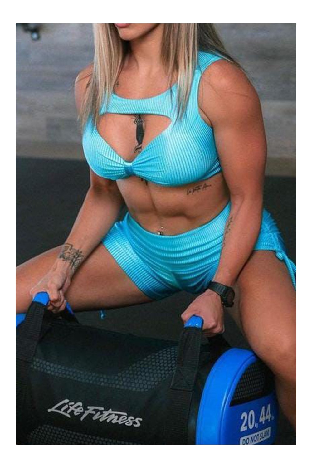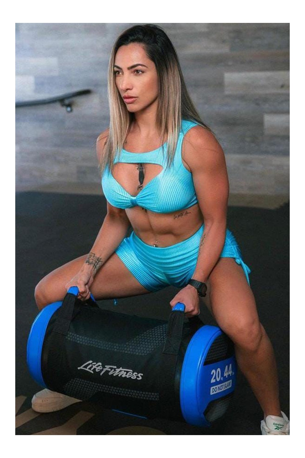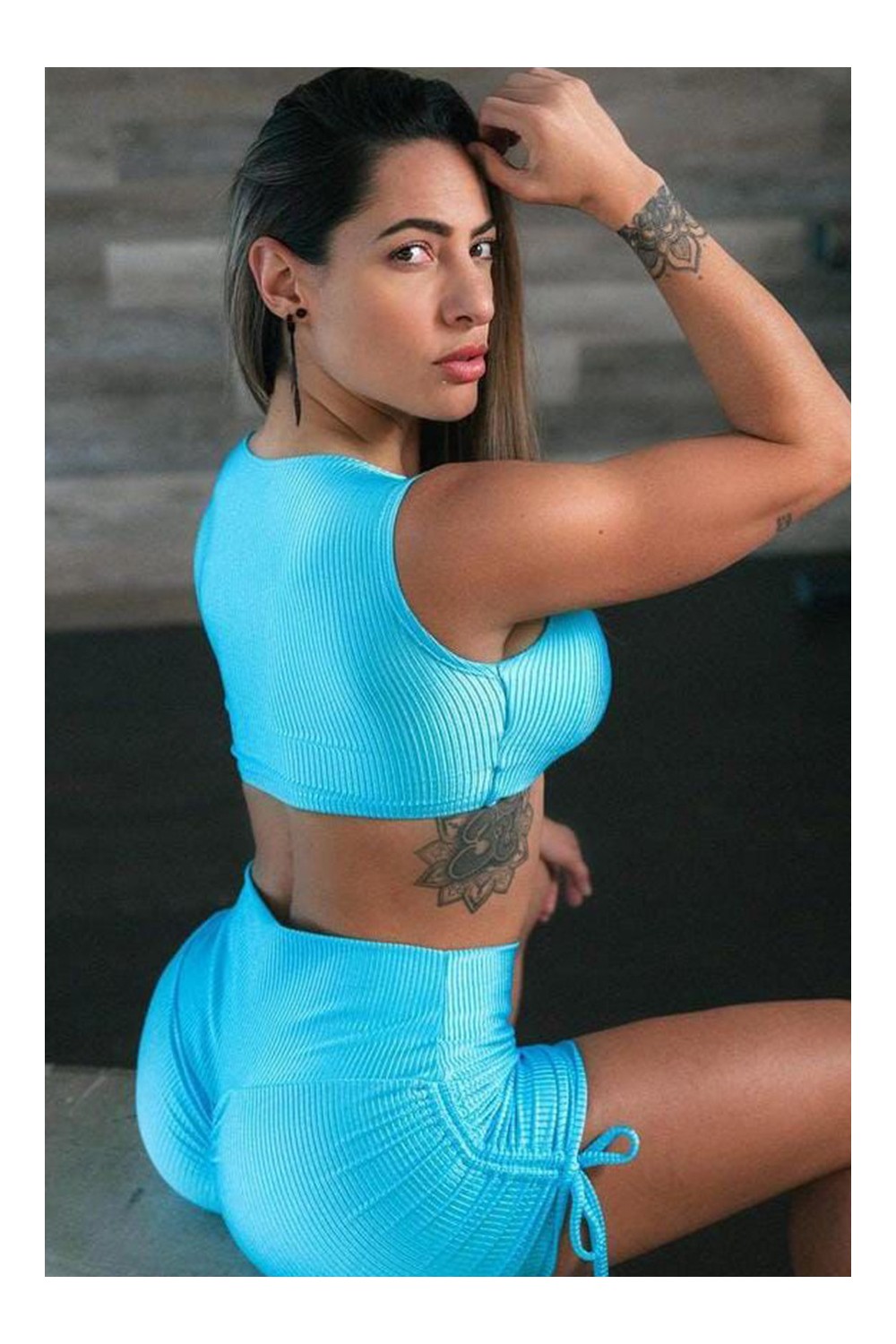 Características: Conjunto liso azul e divertido, modelando perfeitamente o corpo.