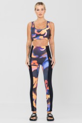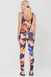Características: Um estiloso conjunto fitness feito com estampa abstrata em laranja, preto e azul em toda a peça, composto por um top cropped com alças grossas, e uma legging de cintura alta e detalhes adicionais com alças pretas nas laterais das pernas .