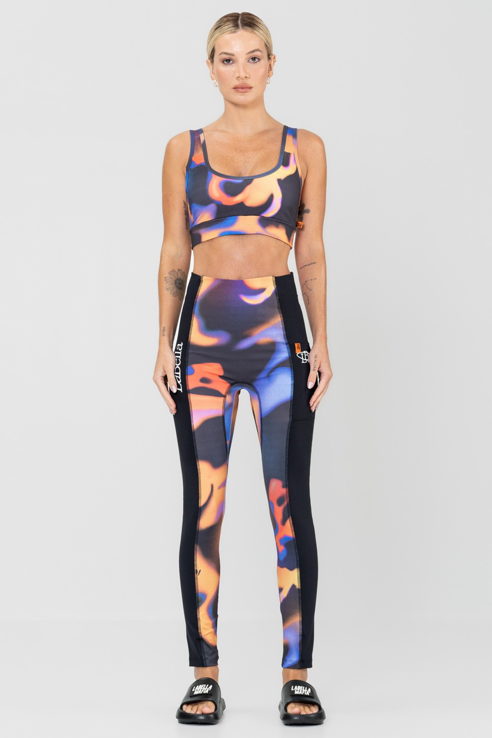 Revitalize seu guarda-roupa de treino com nosso elegante conjunto de fitness! Esta dupla dinâmica apresenta uma estampa abstrata em laranja, preto e azul que cobre toda a peça, adicionando uma vibração vibrante e energética à sua coleção de roupas esportivas. O top cropped, completo com alças grossas, exala estilo e conforto. Combinado com leggings de cintura alta e detalhes adicionais com tiras pretas nas laterais das pernas, este conjunto é o epítome do ousado e moderno.