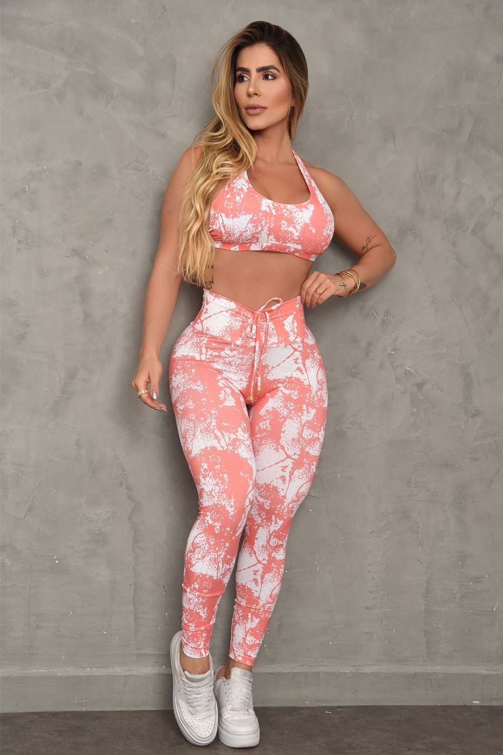 Conjunto fitness com estampa abstrata em tom de salmão. Top com costas nadador e amarração, confere sustentação no busto e o caimento fica perfeito no corpo. A legging é bem justa e fica super charmosa. Look perfeito pra qualquer ocasião.