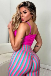 Conjunto fitness vibrante composto por top pink com detalhe em argola central e recorte frontal, valorizando o colo com um toque moderno. A calça legging apresenta listras verticais em tons de rosa, azul e verde neon, com cós alto e franzido no bumbum, realçando a silhueta e alongando a postura. Ideal para quem busca estilo marcante e conforto em peças de alta performance.