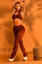 Conjunto fitness flare confeccionado em tecido de alta compressão, que valoriza as curvas e garante conforto. O top possui decote halter com franzido central e excelente sustentação, enquanto a calça flare modela o corpo e alonga a silhueta. Ideal para treinos ou composições casuais com estilo.