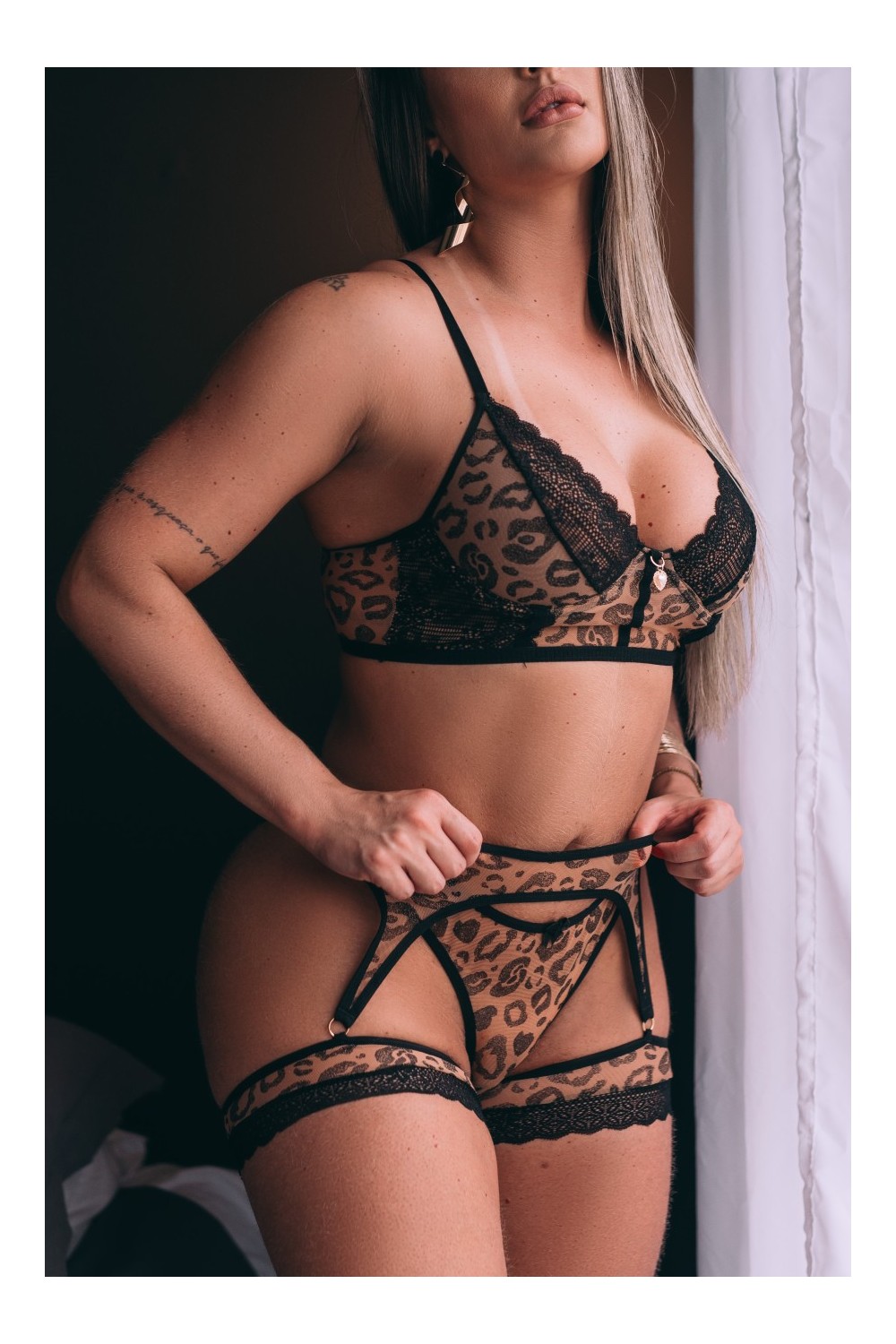 Características: Conjunto estampado em animal print de cropped sem bojo, cinta liga e calcinha.