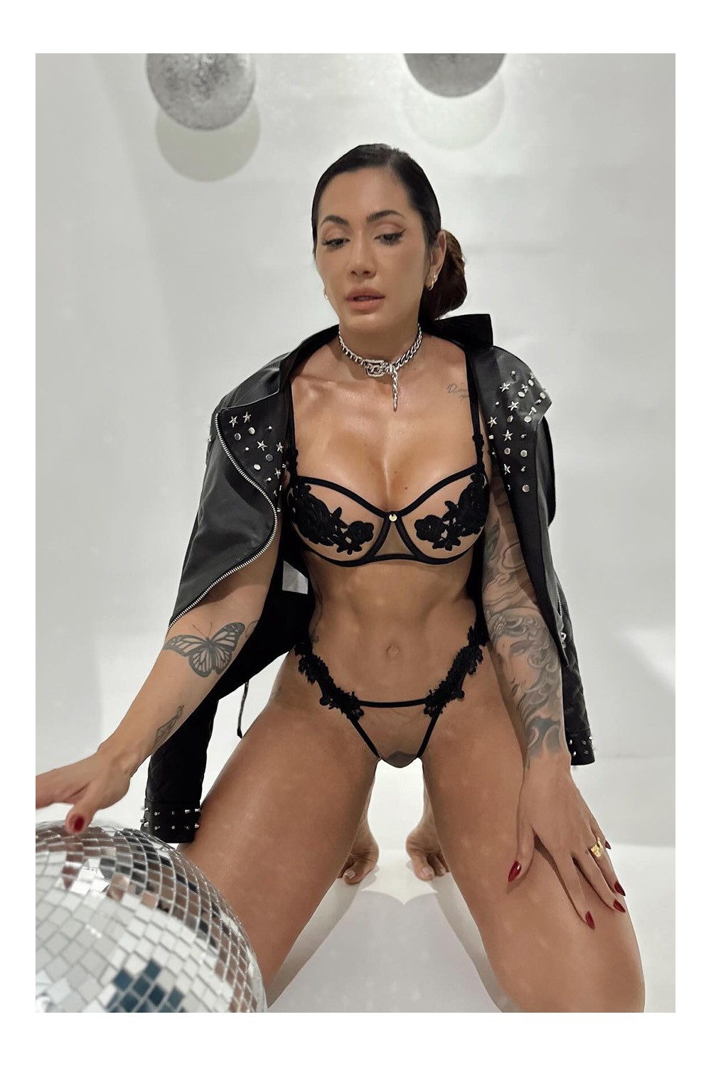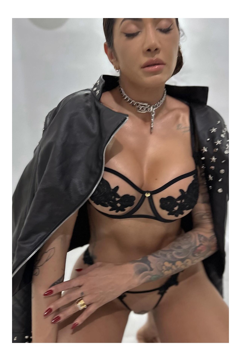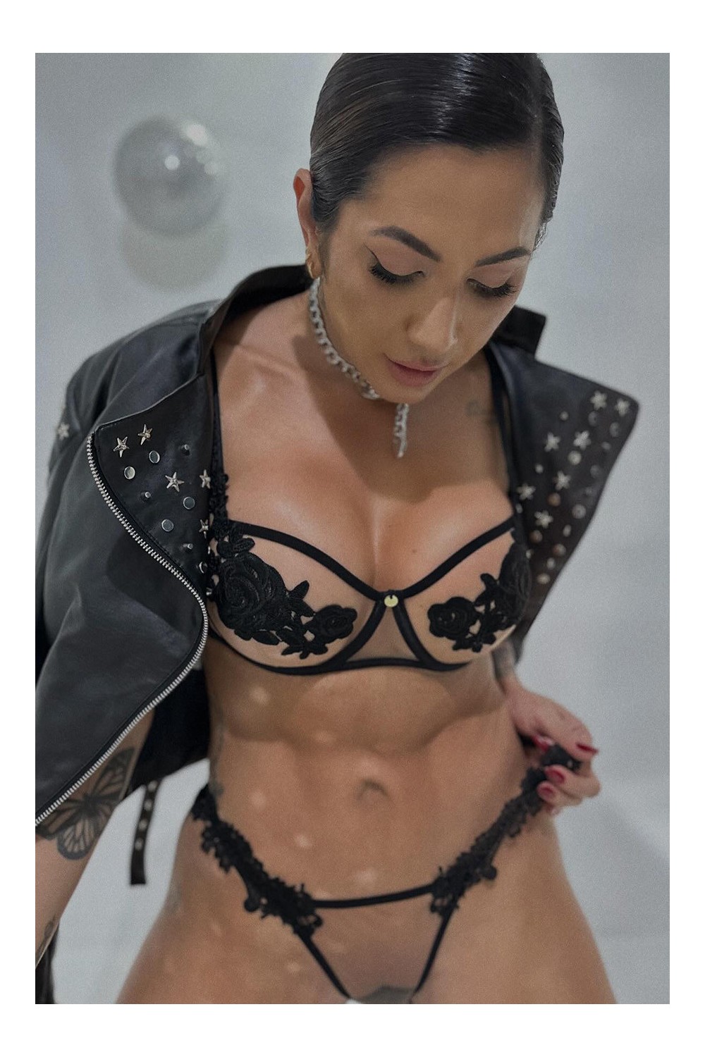 Este conjunto de lingerie preto combina tule, bordados florais e transparência, sem bojo, apenas com aro, garantindo conforto e sensualidade. Ideal para ocasiões especiais, é puro charme e elegância!