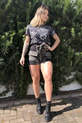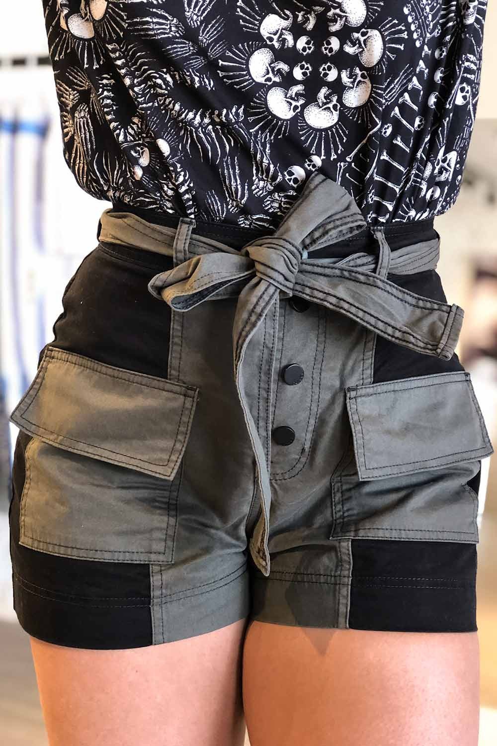 Short de sarja na cor cinza e preto, possui bolsos atrás e na frente.