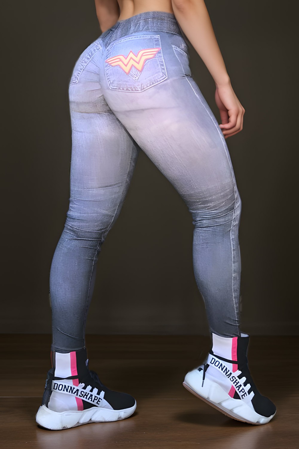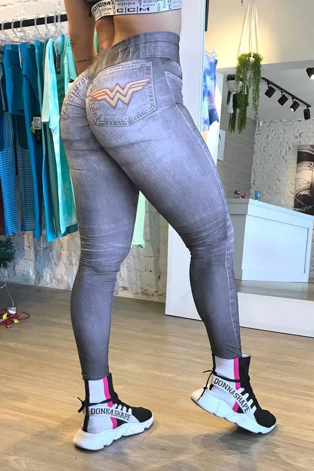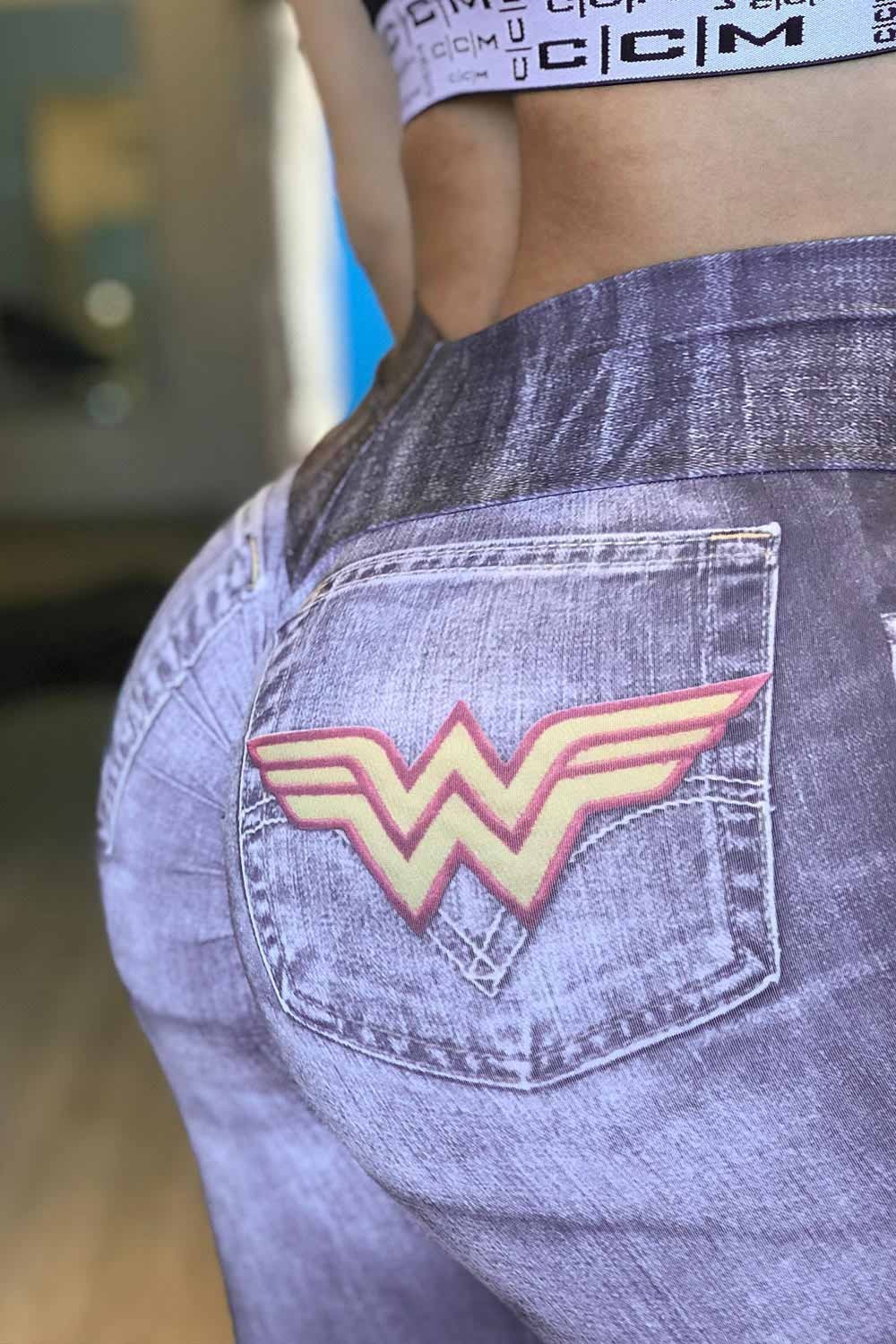 Características: Legging feito em tecido estampado Fake Jeans, com simbolo da Mulher Maravilha atrás. Possui modelagem que se ajusta ao corpo, com franzido atrás, dando efeito "empina bumbum".