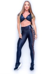 Características: legging em cirrê estampado em preto, com recortes nas laterais em arrastão e escritos nas laterais em silk branco.