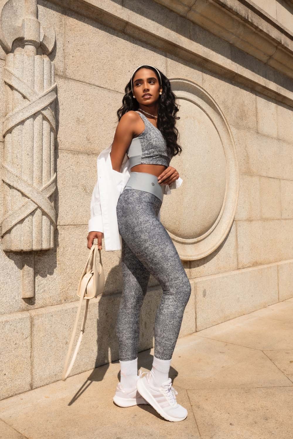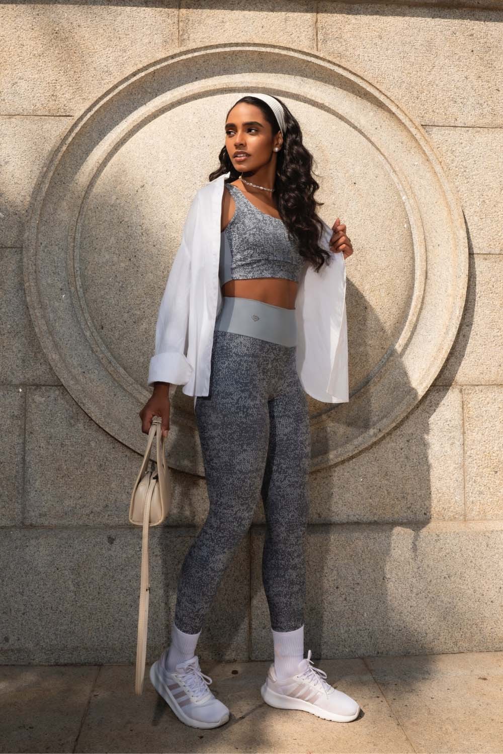 Legging fitness em tom cinza místico, confeccionada em tecido com leve e com textura sutil que adiciona um toque moderno e elegante ao visual. Possui cintura alta com faixa cinza claro, modelando a silhueta. O comprimento oferece liberdade de movimento, sendo ideal para atividades físicas ou composições casuais. A peça combina praticidade e estilo, destacando-se pelo caimento ajustado ao corpo, valorizando as curvas sem comprometer o conforto. Legging sem empina bumbum.