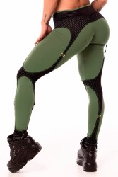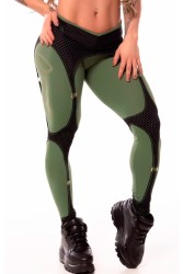 Legging estilosa em tom militar com detalhes em tela e argolas metálicas, que realçam as curvas e trazem um visual moderno e ousado. Conforto aliado a design exclusivo para treinos e looks casuais.