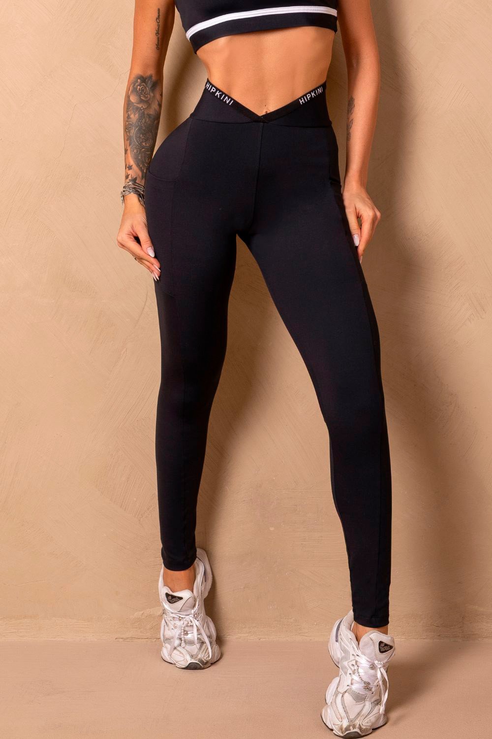 Legging preta de cintura alta com cós em “V” e elástico personalizado HIPKINI. Modelagem justa que valoriza as curvas, confeccionada em tecido macio e de alta compressão, garantindo conforto e sustentação durante o treino. Estilo moderno e versátil para compor looks fitness ou casuais.