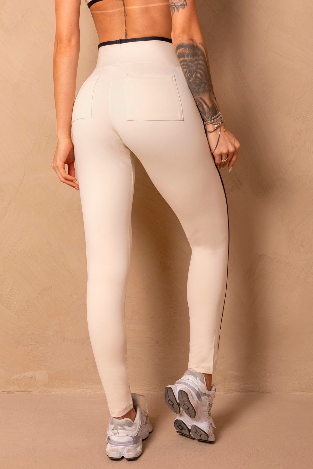Legging creme com recortes laterais em preto que alongam a silhueta e realçam as curvas. Cós alto com logo centralizado que garante sustentação e conforto durante o treino ou no dia a dia.
