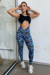 Diferencial: Macacão com legging estampada e top preto, com cintura recortada. COM EMPINA BUMBUM