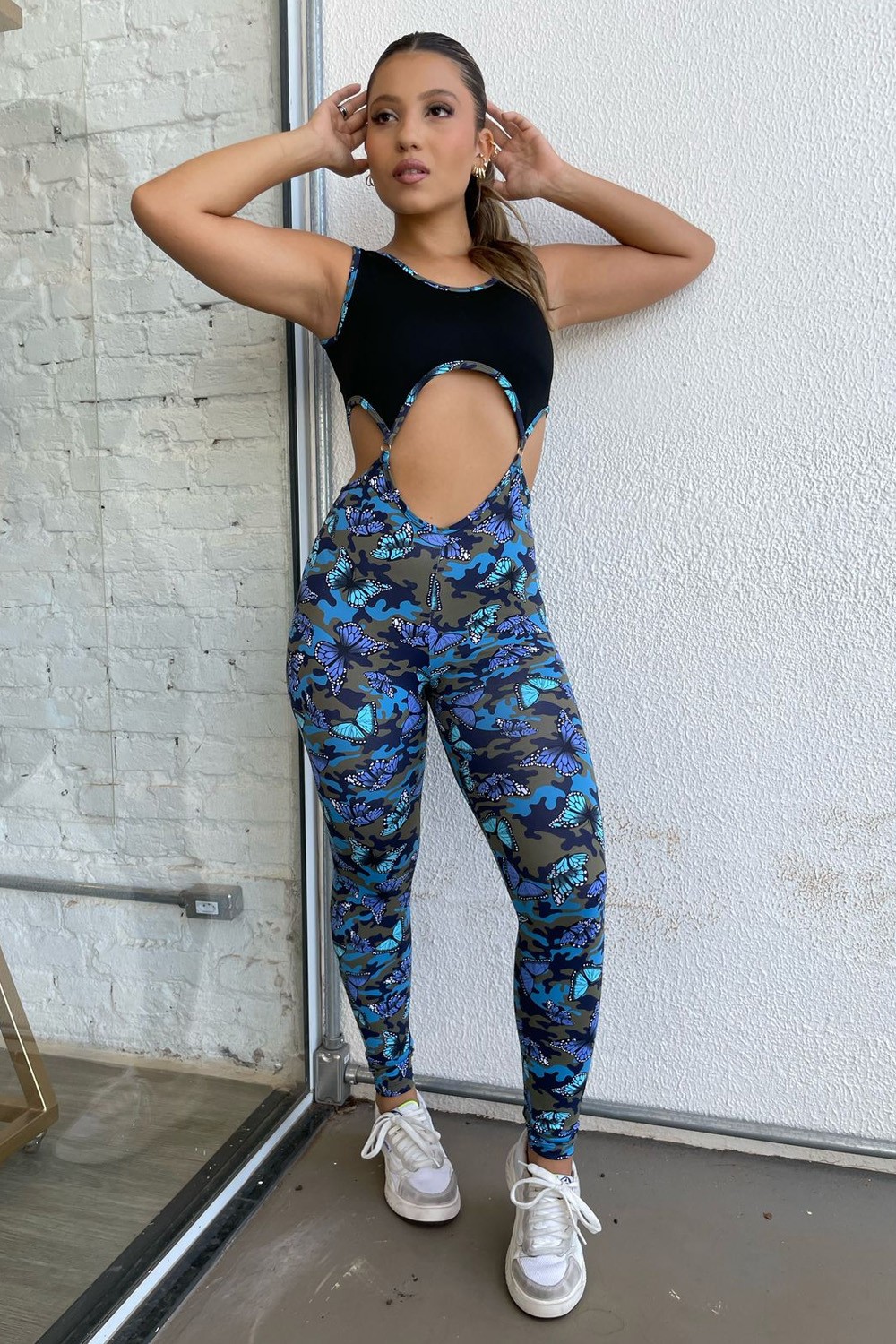 Novo macacão longo, azul com estampa de borboletas e top preto contornado com a mesma estampa. O abdômen é recortado ao redor da cintura, ressaltando as curvas e trazendo maior charme para esse look super gracioso e cheio de confiança. Perfeito para desfilar nas academias ou em situações casuais.