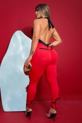 Macacão feminino longo, confeccionado em tecido altamente modelador e de alta elasticidade, que valoriza a silhueta e proporciona conforto. A parte superior possui decote em V e é sustentada por alças que se amarram no pescoço, deixando as costas totalmente nuas, ideal para um visual impactante. Nas cores vermelho e preto, confere elegância e impacto para peça. A calça possui modelagem justa com recorte empina bumbum e bolsos traseiros funcionais.