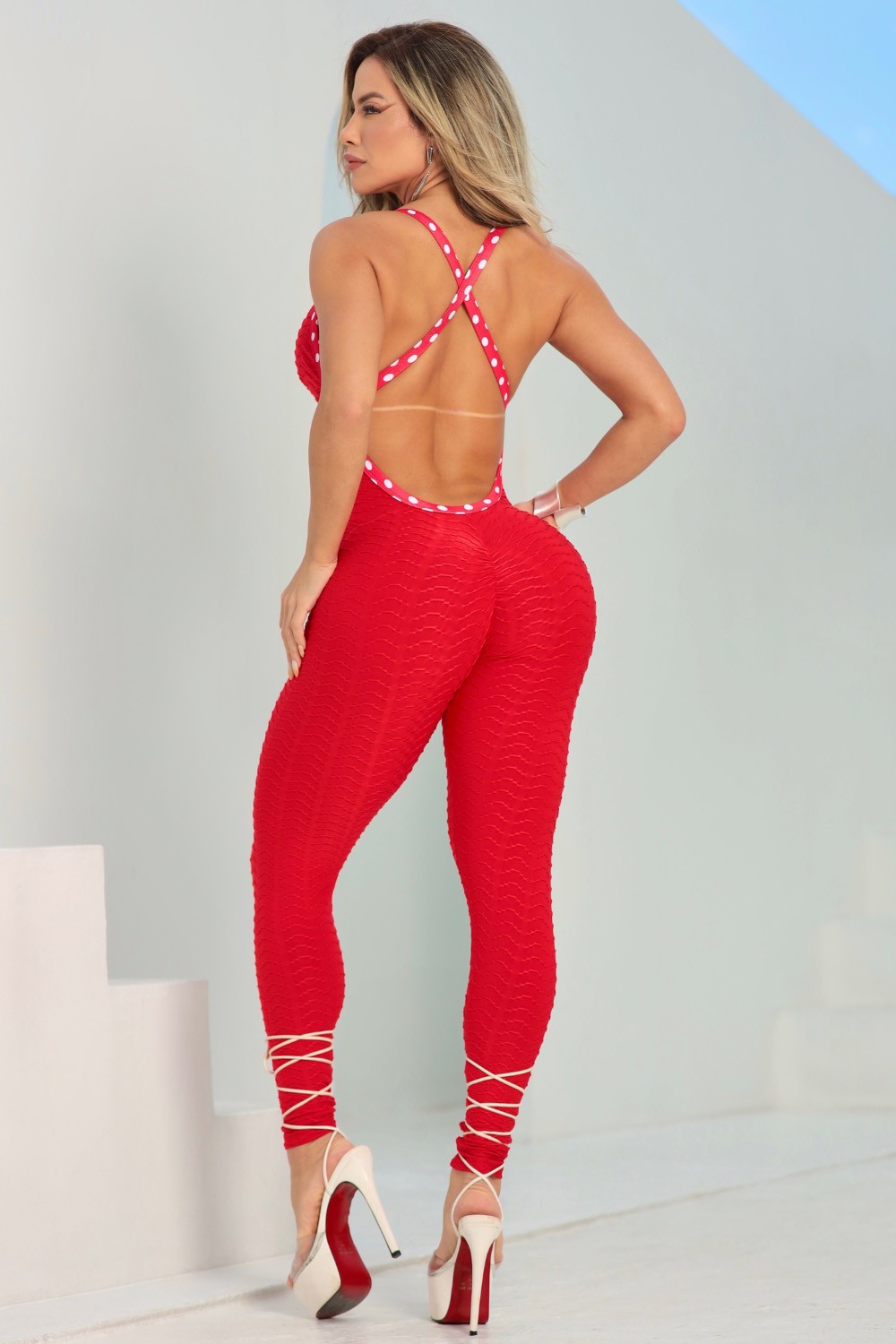 Macaquinho justo ao corpo com modelagem que valoriza a silhueta. Confeccionado em tecido texturizado de cor nude com leve transparência, possui decote profundo com detalhe em alças estampadas que contornam o busto e cruzam nas costas, deixando a parte traseira praticamente toda aberta. O comprimento é longo, ajustado até a barra, oferecendo caimento elegante e sensual. Ideal para composições ousadas e modernas.
