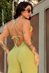 Macacão fitness em tecido brocado de alta compressão, com modelagem anatômica que realça as curvas e garante ajuste perfeito ao corpo. Possui recortes estratégicos com mix de cores, decote estruturado e costas abertas com amarração, unindo sustentação, conforto e impacto visual para treinos e produções fashion fitness.