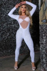 Características: Macacão fashion todo branco com mangas longas e tela de tecido de tule branco sobreposta a ampla abertura decorativa na parte frontal do tronco, com detalhes adicionais de brilho nas pernas e braços da peça.
