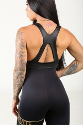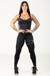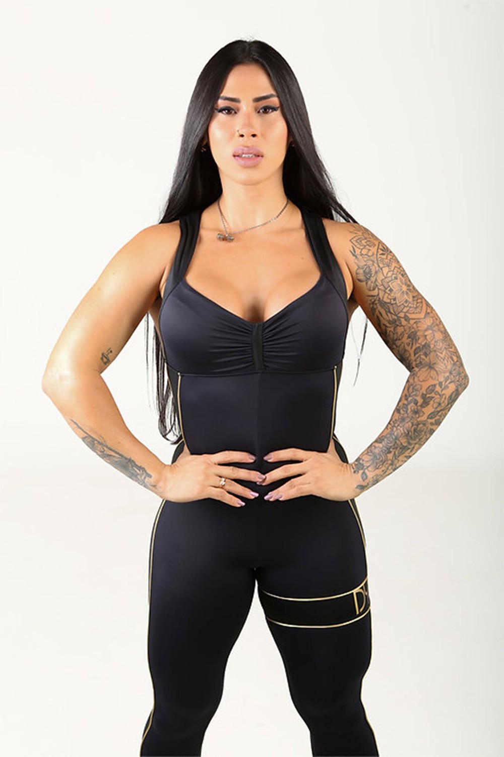 Características: Macacão fitness preto com detalhes em dourado, super confortável para se usar no dia a dia e fazer seus treinos com mais estilo!
