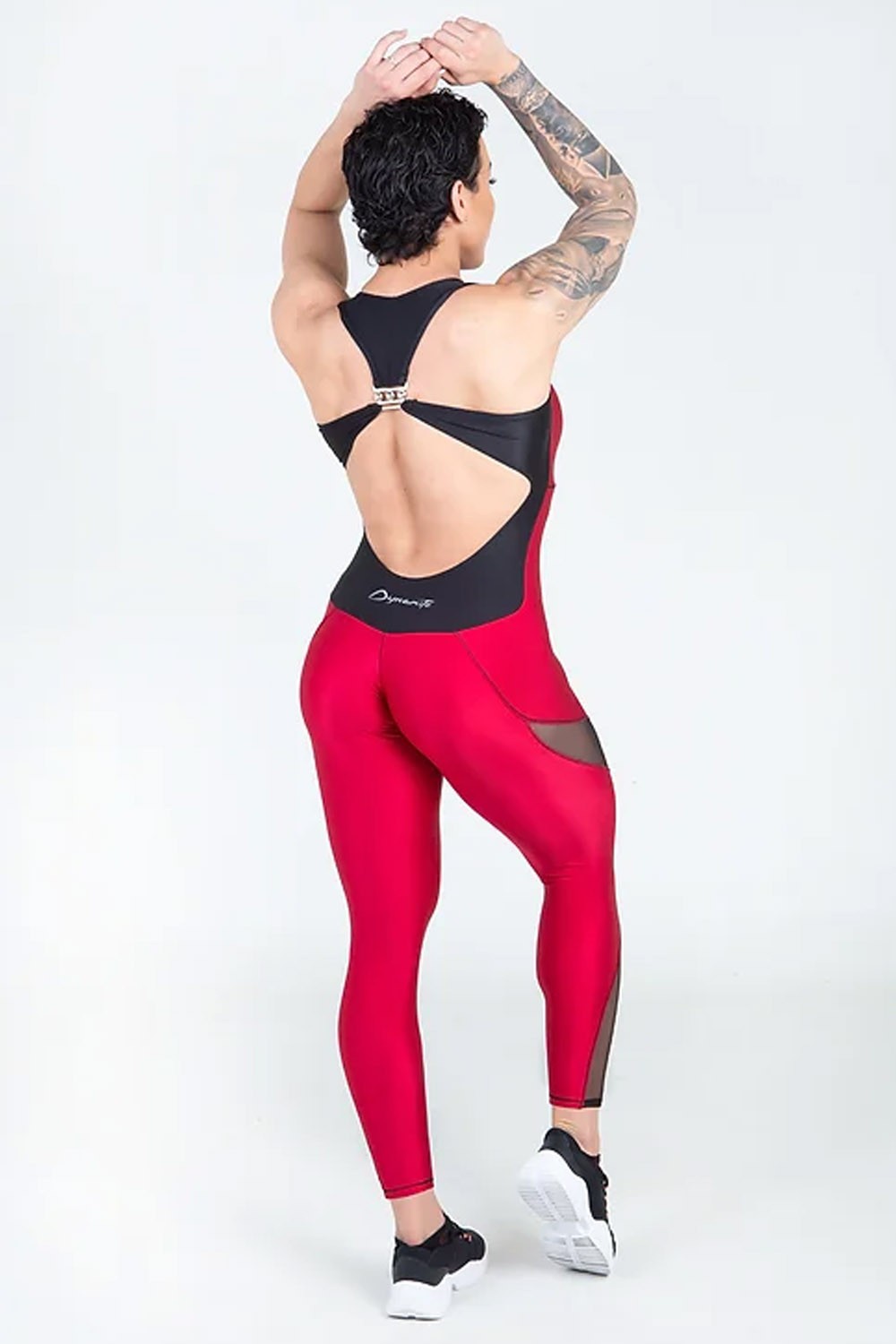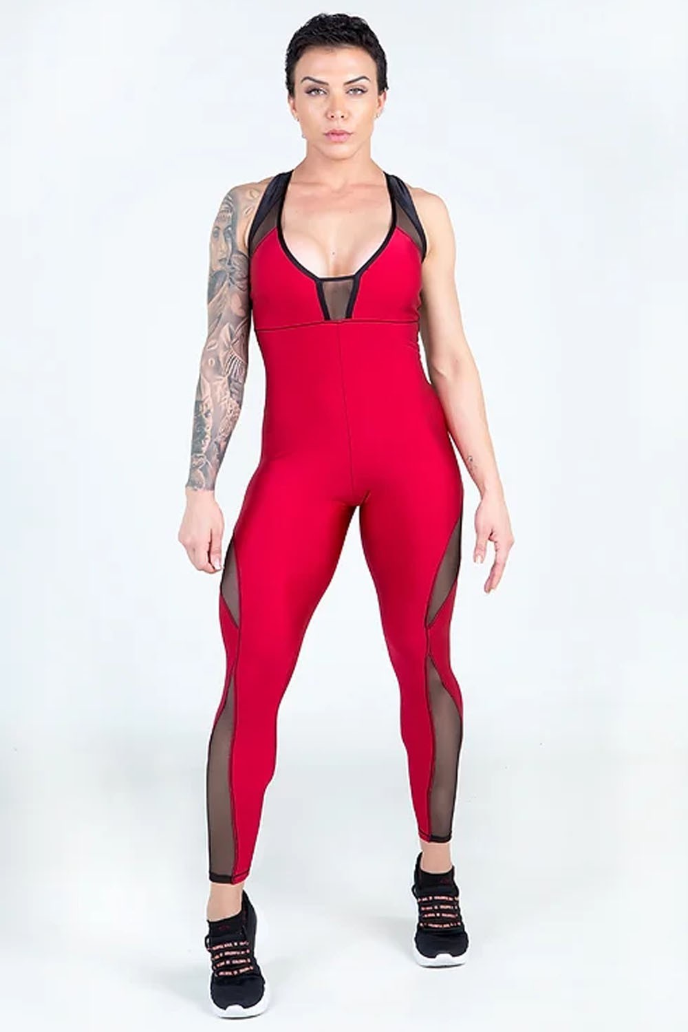 Características: Macacão fitness vermelho, modelagem com costas abertas, com alças pretas e detalhamentos adicionais em telas de tule nas pernas e sobre o decote da peça. Ótima elasticidade e secagem rápida.