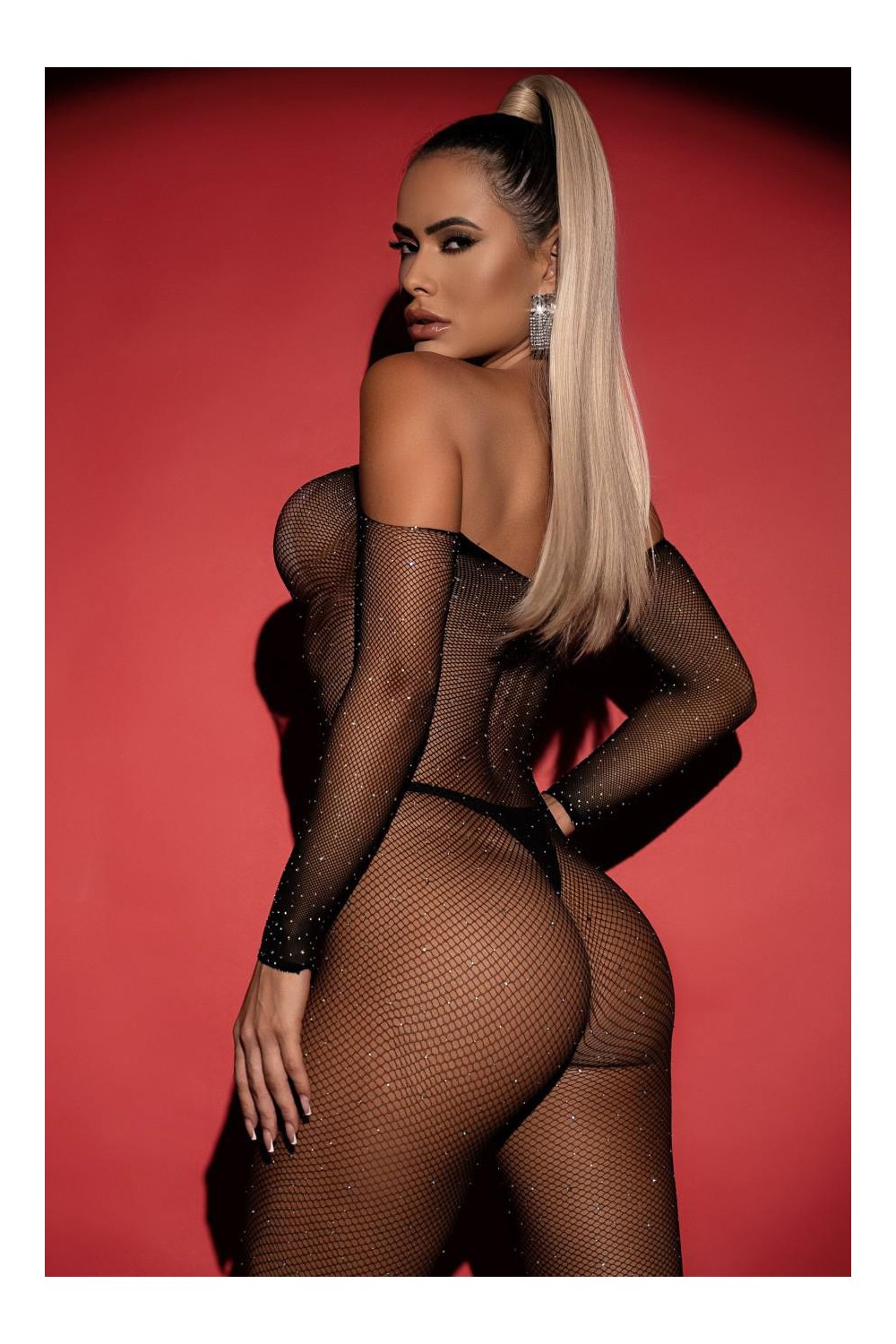 Macacão em tule transparente com aplicação de microcristais, modelagem completa e manga longa. A peça combina sensualidade e brilho na medida certa, com decote ombro a ombro e recortes estratégicos que valorizam as curvas. Ideal para ocasiões noturnas ou produções ousadas com atitude.