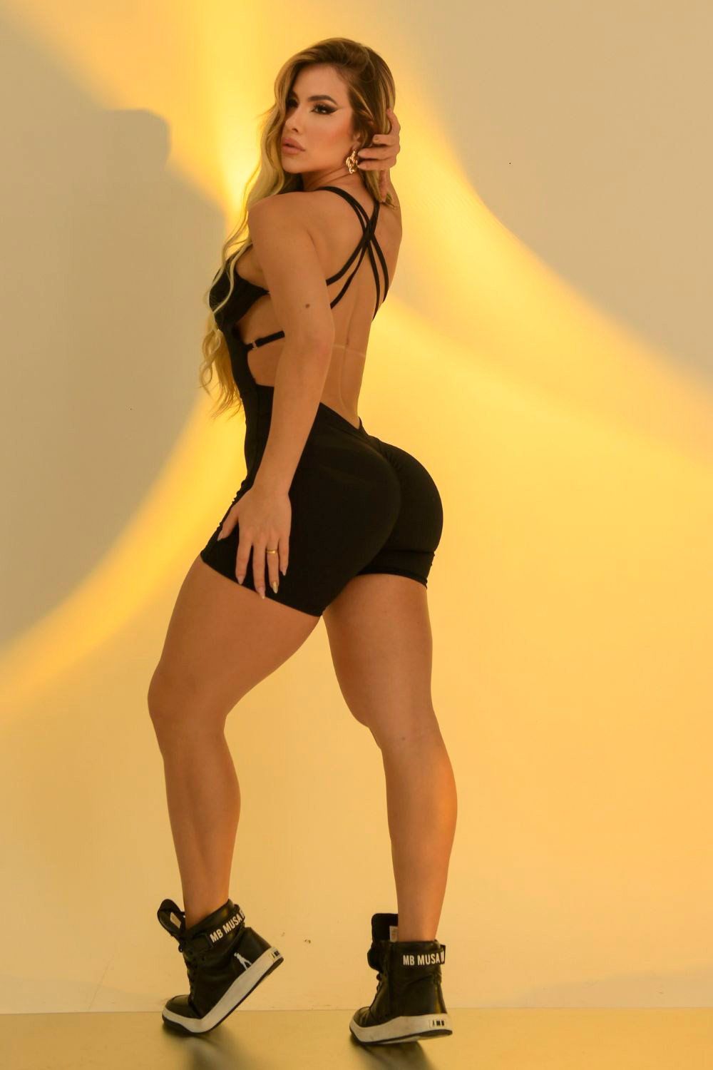 O macaquinho é confeccionado em tecido justo e elástico, modelando a silhueta. Possui decote em “V” com franzido discreto no busto e alças finas que se cruzam nas costas, deixando a parte traseira quase totalmente aberta. A cintura é marcada pela própria modelagem, que alonga e valoriza a forma do corpo, conferindo um visual minimalista e sofisticado.