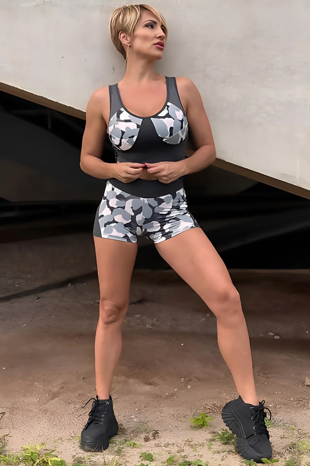 Shorts fitness com cós alto e compressivo, oferecendo sustentação e valorizando a silhueta. O destaque fica para o recorte arredondado na parte de trás, com estampa camuflada em tons de azul, cinza e branco, que realça o contorno dos glúteos. O tecido é firme, de alta elasticidade, garantindo ajuste perfeito ao corpo e liberdade de movimento. As costuras reforçadas e o design anatômico proporcionam conforto e efeito modelador, ideal para treinos intensos ou uso casual esportivo.
