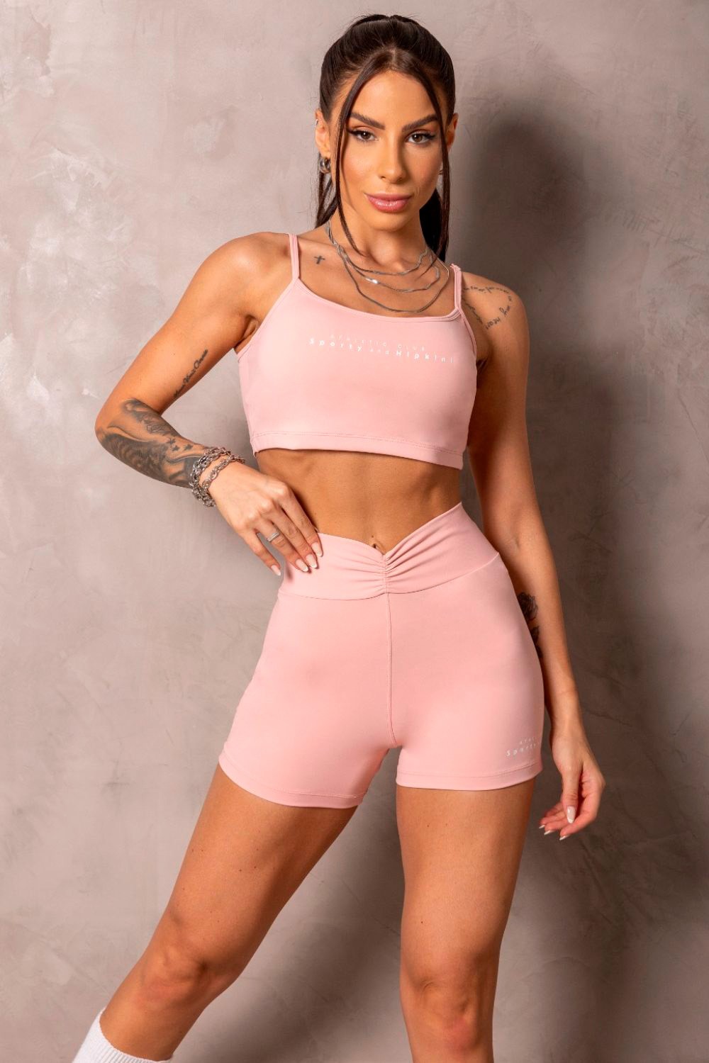 Shorts rosa com modelagem justa e toque suave, garantindo sustentação e conforto. O shorts apresenta detalhe drapeado na parte frontal, que valoriza a cintura e adiciona um charme delicado ao visual fitness.