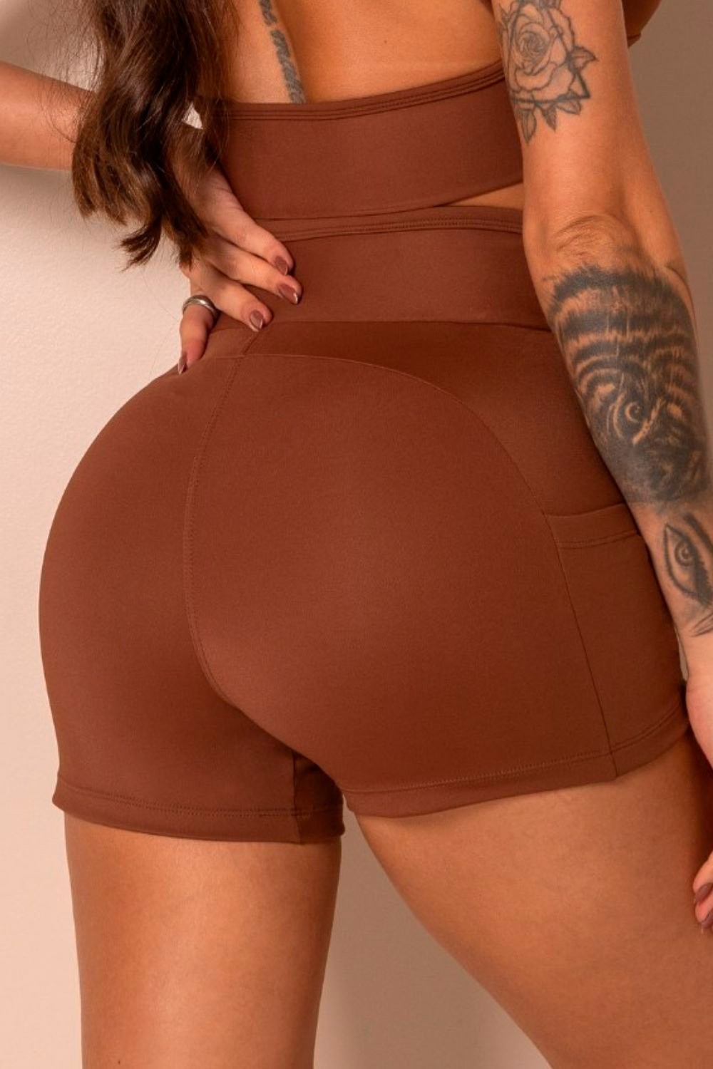 Shorts na cor marrom com modelagem que desenha sua silhueta e traz estilo e exclusividade. Confortável, moderna e perfeita para treinos ou composições casuais.