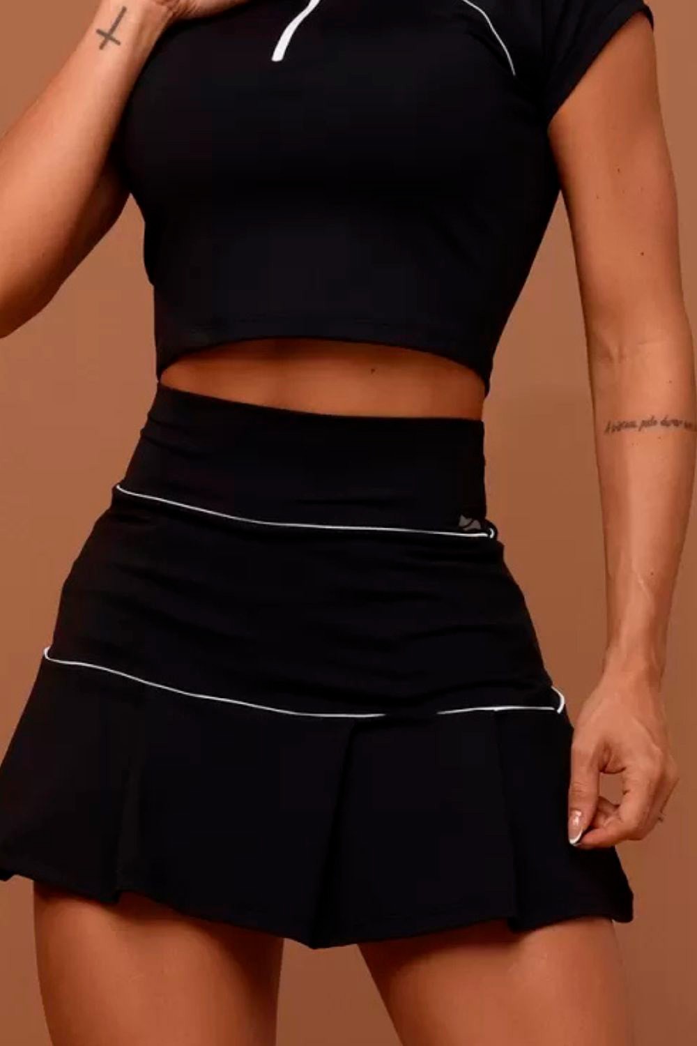 Shorts saia preto com cós alto que garante conforto e segurança. Possui short interno com bolso funcional e acabamento clean, ideal para treinos e práticas esportivas com estilo e liberdade de movimento.
