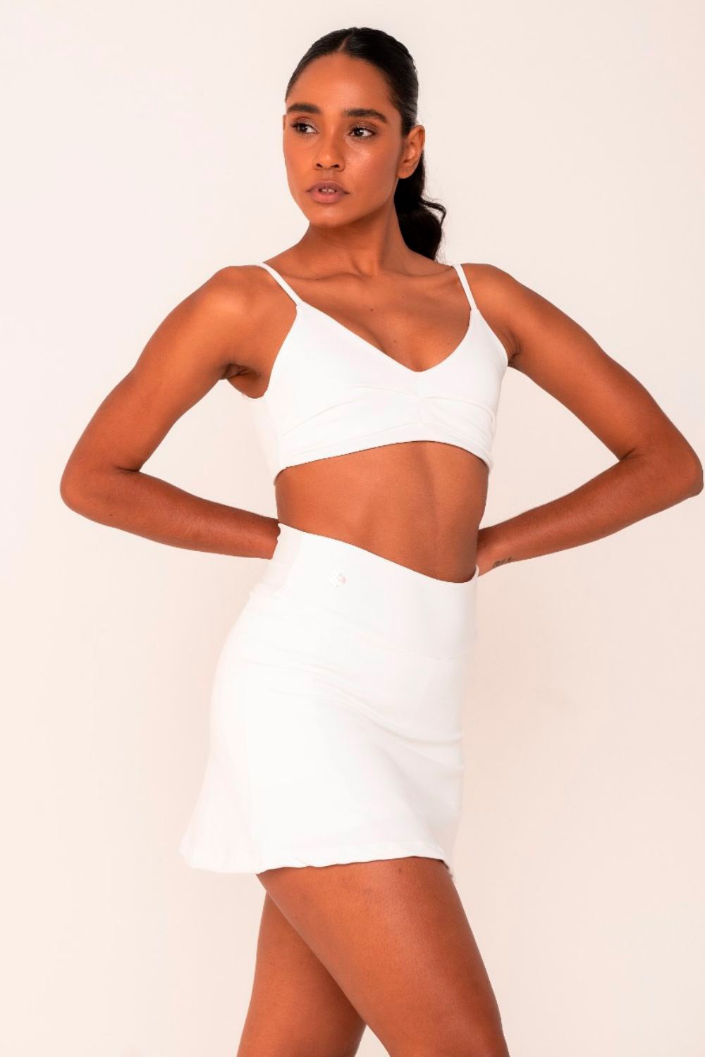Shorts saia fitness Branco com bolsos internos, embaixo da saia, de forma bastante discreta e segura.