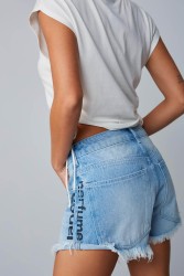 Características: Shorts jeans com barra desfiada e silk preto lança perfume.
