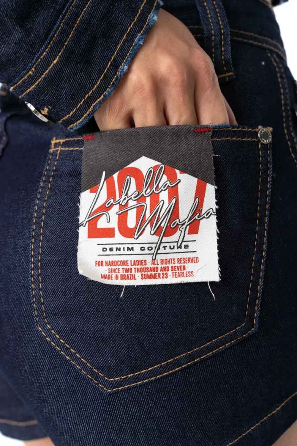 Características: Shorts jeans com elástico no cós, molagem justa, lavanderia escura, patche personalizado na perna e etiqueta personalizada no bolso trazeiro.