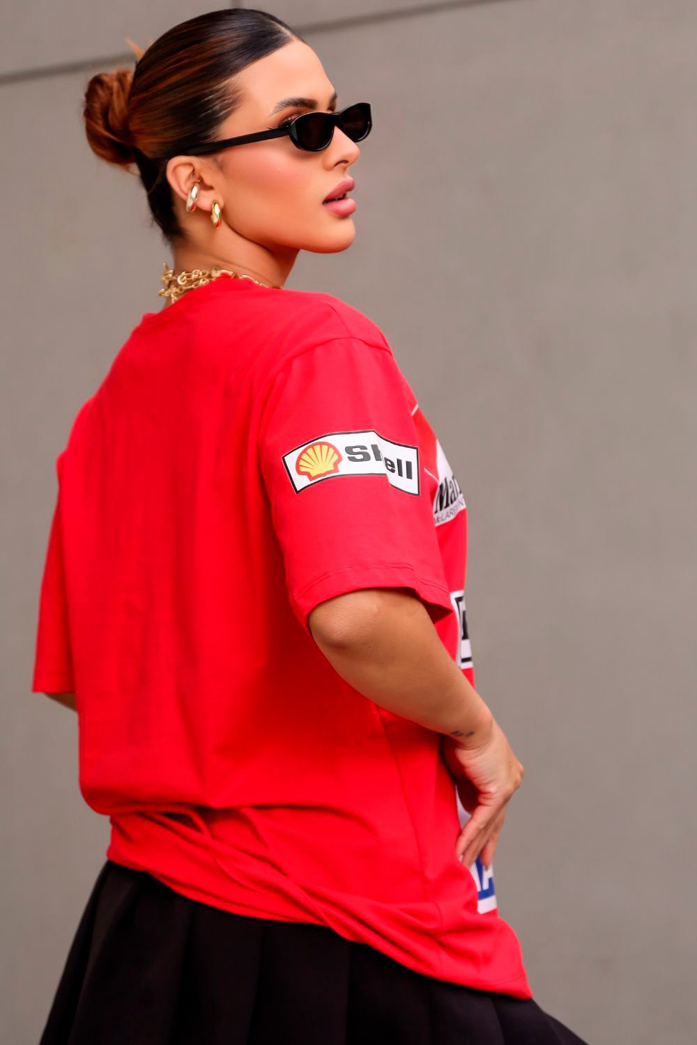 T-Shirts vermelha estilo racing com logos e modelagem ampla, perfeita para looks urbanos.