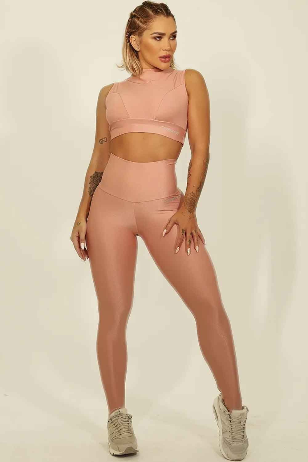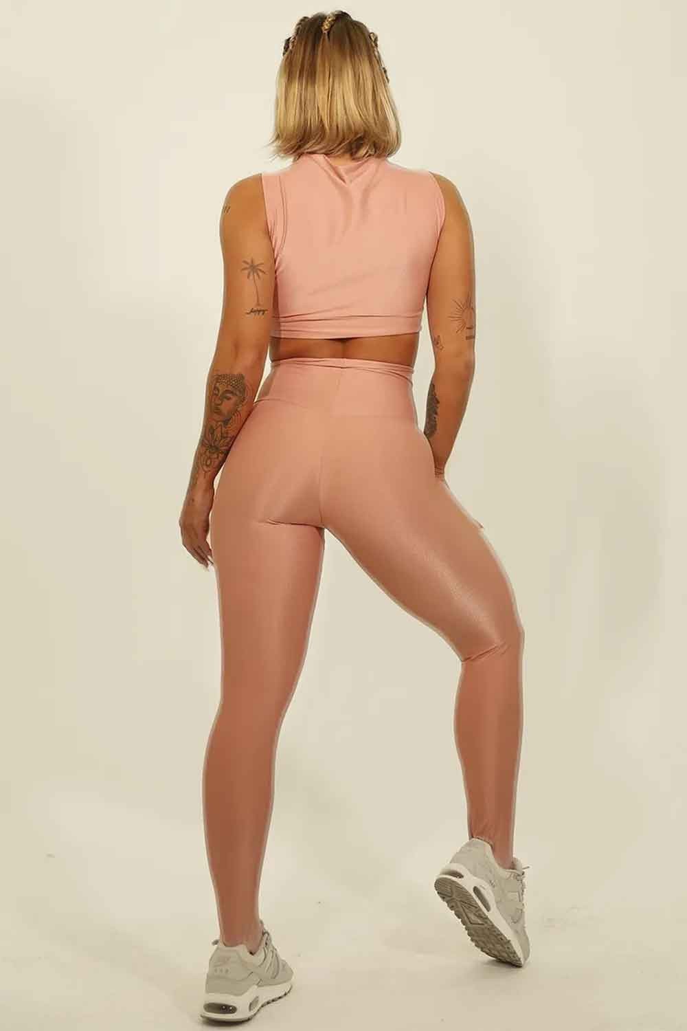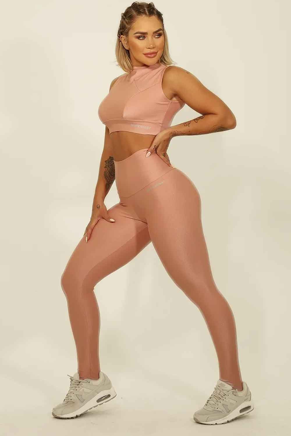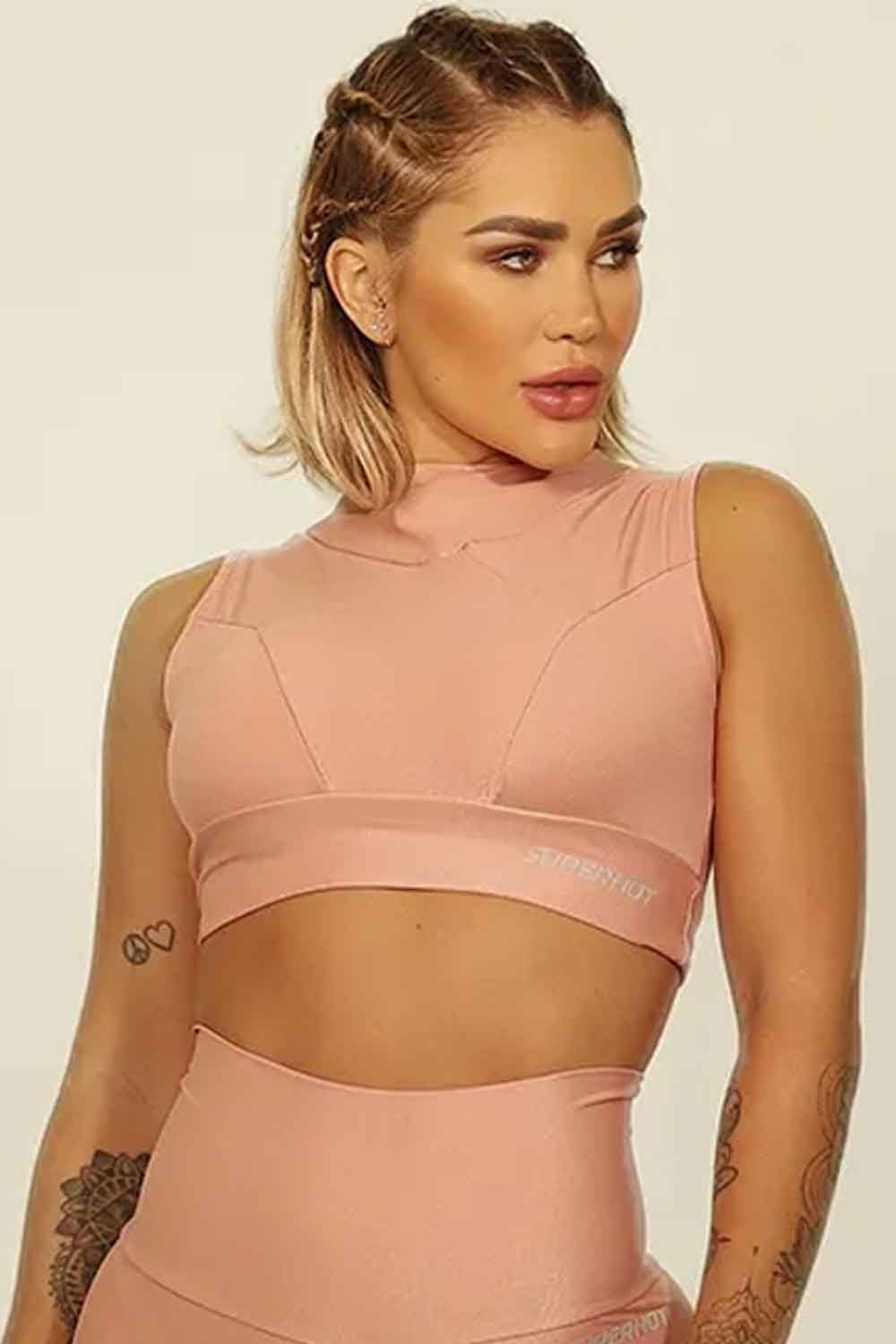 Características: Top mais fechado com gola alta, detalhes em costura que valorizam o busto e tecido canelado com acabamento brilhoso.