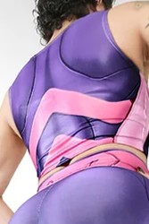 Os detalhes em roxo adornam o top de maneira estratégica, acrescentando profundidade visual e uma pitada de drama. Esses detalhes podem estar presentes nas bordas, nas costuras ou até mesmo em padrões sutis que percorrem o tecido.