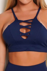 Características: Um top fitness azul marinhi com corte baixo e alças cruzadas.