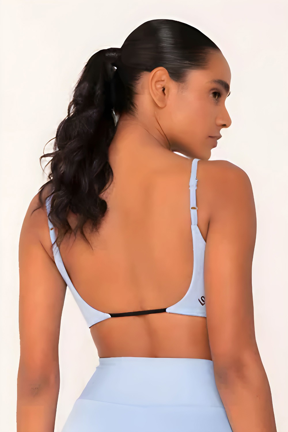 Top com alças finas reguláveis, decote em V e recorte central que valoriza o busto, desenvolvido em tecido de alta elasticidade para máximo conforto e ajuste perfeito ao corpo.