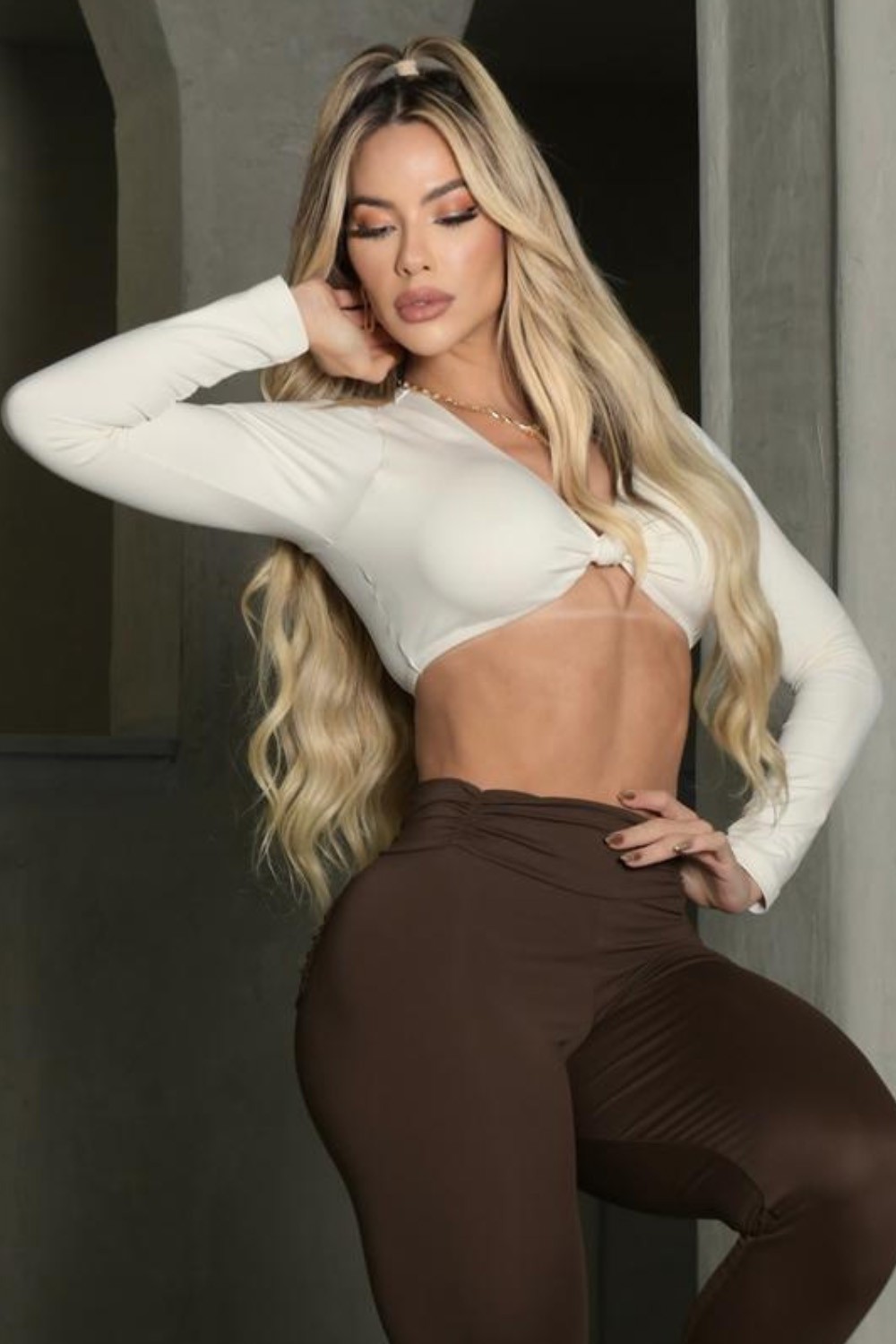 O top cropped de manga longa, na cor off-white, possui decote V e um nó frontal que realça a cintura. Confeccionado em tecido leve e justo, ele é versátil para diversas ocasiões, combinando estilo e conforto.