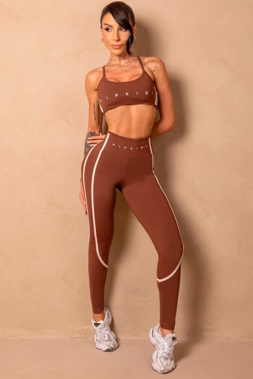 Top marrom com viés nude nas laterais e alças finas ajustáveis. Possui modelagem firme que oferece sustentação e conforto, ideal para treinos ou composições casuais com estilo esportivo.