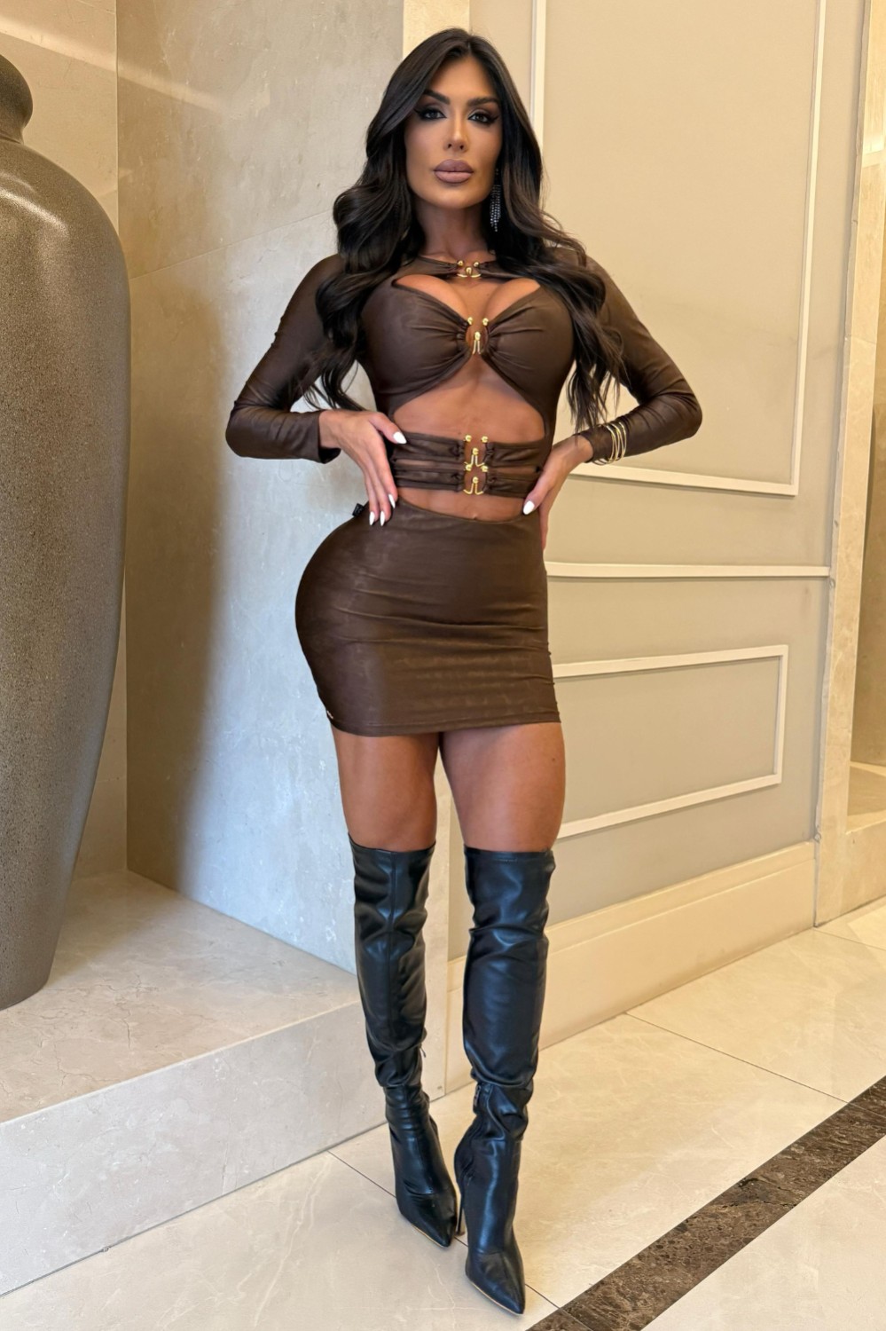 Vestido curto em tecido acetinado marrom, com modelagem justa ao corpo. Possui recortes estratégicos na região do abdômen, decote torcido e detalhe de argolas douradas que conectam as partes superiores e inferiores da peça. As mangas são longas e o caimento valoriza a silhueta com um toque sensual e sofisticado. Ideal para ocasiões noturnas ou eventos especiais.