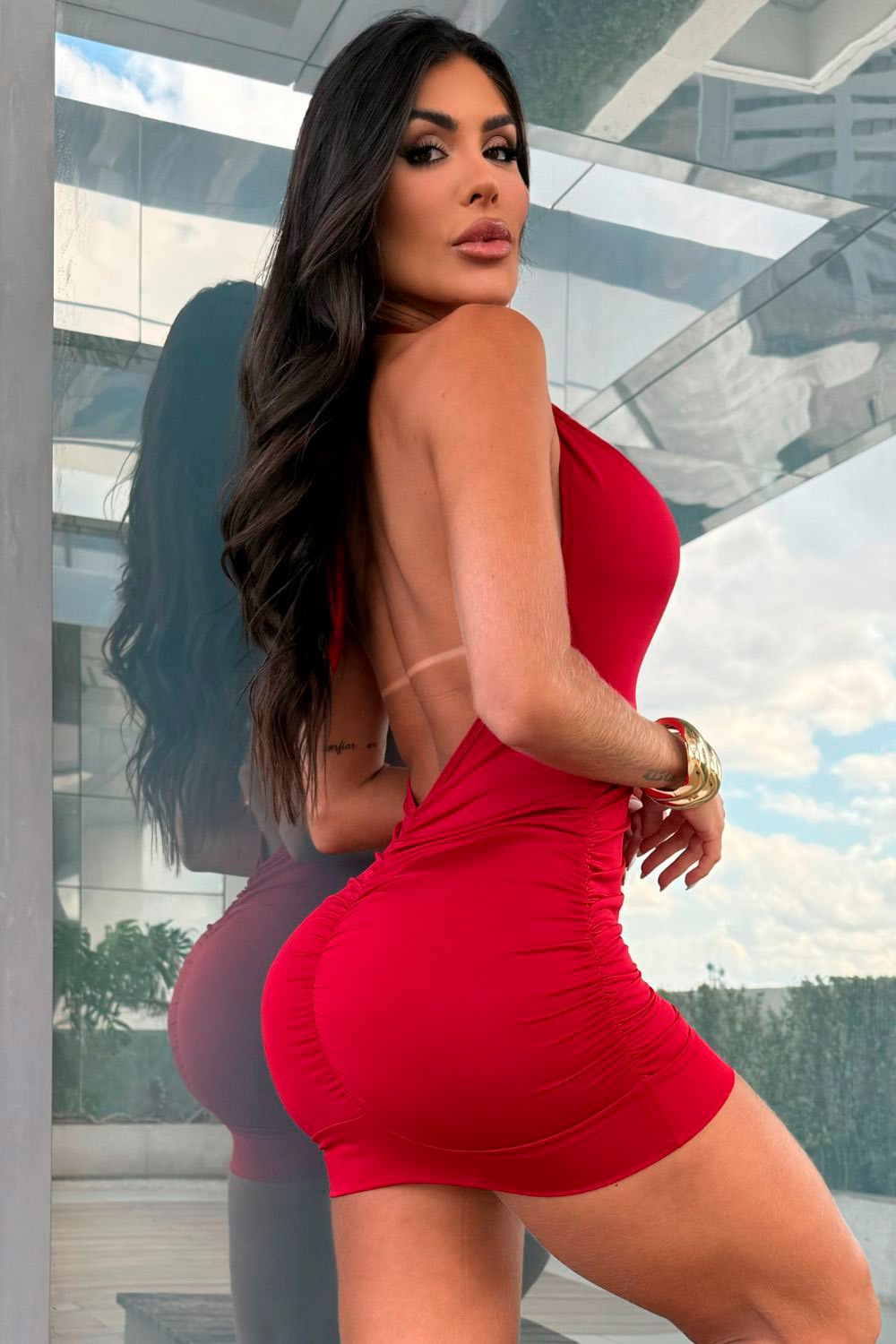 Vestido curto em tecido leve e confortável, com modelagem justa que valoriza a silhueta. Detalhe franzido na parte frontal que proporciona estilo e ajuste perfeito. Decote profundo em V e costas abertas, ideal para ocasiões especiais. Combina elegância e sensualidade com um toque moderno.