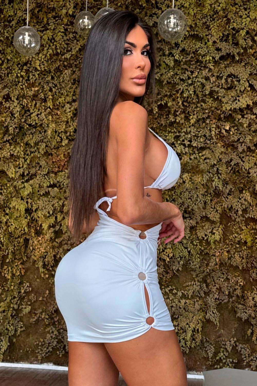 Vestido curto em tecido ajustado ao corpo, com design assimétrico e recorte lateral que valoriza a silhueta. Possui alças finas, decote profundo e detalhe de argolas na lateral, conferindo um toque moderno e sensual. Ideal para produções noturnas e ocasiões especiais.