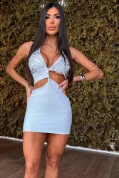 Vestido curto com modelagem justa, destacando recortes frontais e laterais que valorizam a silhueta. O busto possui aplicação de pedrarias em desenho ondulado, trazendo brilho e sofisticação. Uma peça moderna e impactante para produções noturnas.