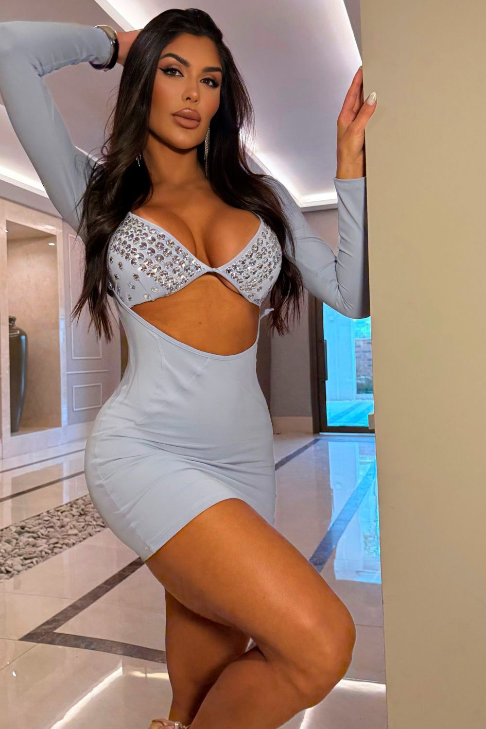 Vestido curto com recorte frontal e modelagem justa que valoriza as curvas. Possui mangas longas e busto com aplicações de pedrinhas, criando um visual marcante e sofisticado para noites especiais.