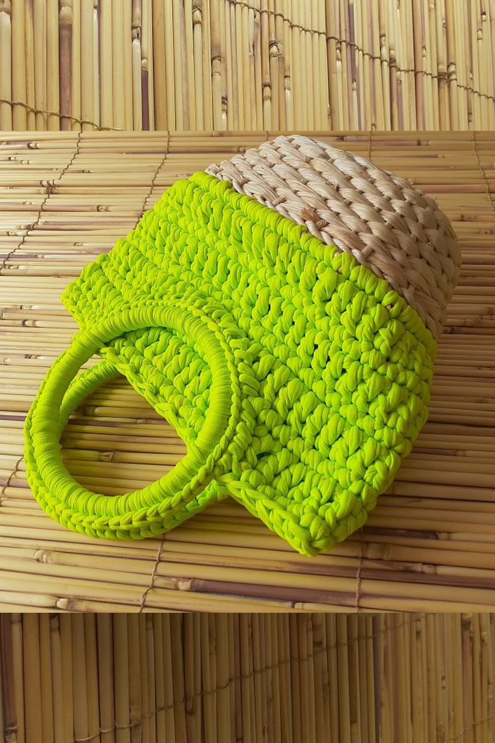 Super stylish beach bag! Made in lime green crochet, with crossed straw details in the base.