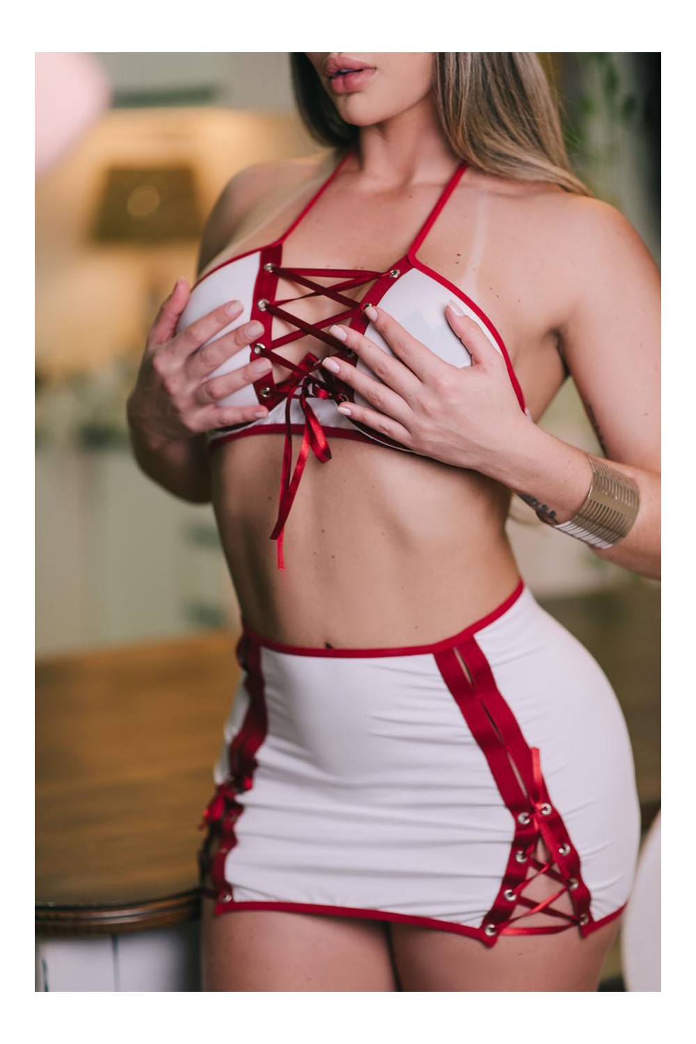 The Tempting Nurse costume combines sensuality and charm, with a top without padding that shapes the bust in a provocative way, using a support hoop and braided ribbon. The skirt with ribbon details adds a daring touch to the look. Each detail was designed to intensify desire and mystery, making it ideal for moments of seduction and fantasy.