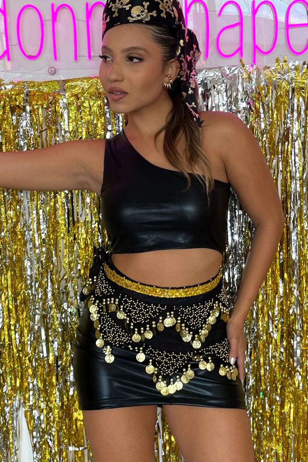 Fashionable black leather top with a shiny touch to the fabric. Single strap over one shoulder, which brings elegance and style to the look, perfect for casual or refined occasions.